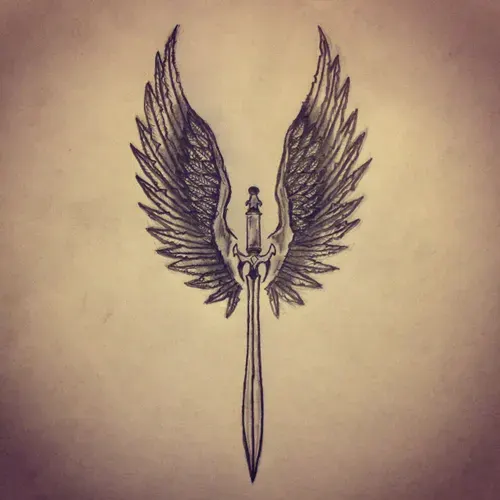 A sword and wings tattoo combines two powerful symbols: the sword representing strength, courage, and protection, and the wings representing freedom, transcendence, and spiritual elevation. This tattoo design symbolizes the balance between fighting for what is right and the desire for freedom and peace. The wings often represent the ability to rise above challenges, while the sword symbolizes the fight against adversity. Together, these elements evoke a sense of spiritual strength, resilience, and the pursuit of higher ideals. A sword and wings tattoo can also represent personal transformation, where the sword cuts through the obstacles in life, and the wings allow for growth and freedom. The design can be highly detailed, with the sword drawn in sharp contrast to the soft, flowing wings. This tattoo is often placed on the back, where the wings can spread across the shoulder blades, or on the forearm or thigh for a more striking, visible design. For those who value both power and the freedom to rise above life’s challenges, this tattoo is a symbol of inner strength and spiritual elevation.
