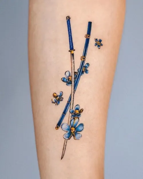 The Japanese katana sword tattoo is a beautifully detailed and intricate design that represents honor, discipline, and the warrior spirit. Katana swords are associated with the samurai, a class of highly skilled warriors known for their code of ethics and commitment to duty. A katana tattoo symbolizes strength, discipline, and the pursuit of mastery, making it a popular choice for individuals who value self-control, honor, and protection. The katana’s sharp blade also represents precision and the ability to focus on a goal with unwavering determination. Often, katana tattoos are paired with traditional Japanese elements such as cherry blossoms, koi fish, or waves, adding layers of meaning and personal symbolism. The katana tattoo is commonly placed on the back, arm, or side, where the long blade can be depicted with intricate detail. This tattoo appeals to those who appreciate Japanese culture, samurai history, or the idea of facing challenges with honor and precision.
