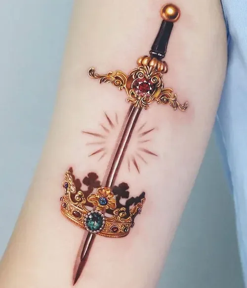 The sword with a crown tattoo is a powerful emblem of leadership, honor, and royalty. The sword represents strength, power, and protection, while the crown symbolizes authority, responsibility, and sovereignty. Together, these elements convey a message of someone who is destined for greatness, possesses leadership qualities, or has the ability to protect and rule over their domain. The sword with crown tattoo often signifies the wearer’s inner strength and their readiness to take on the responsibilities of leadership. It can also reflect a personal journey toward self-mastery, where the sword symbolizes the tools needed to conquer challenges and the crown represents the reward of personal growth and success. The design is often detailed, with the crown intricately designed to emphasize nobility and the sword’s sharpness symbolizing clarity and purpose. This tattoo is often placed on the upper arm, chest, or back, where it can be seen as a bold statement of authority and strength. For those who see themselves as natural leaders or protectors, this tattoo serves as a reminder of the power and responsibility that come with leadership.