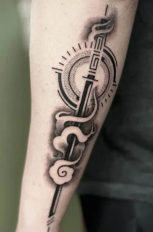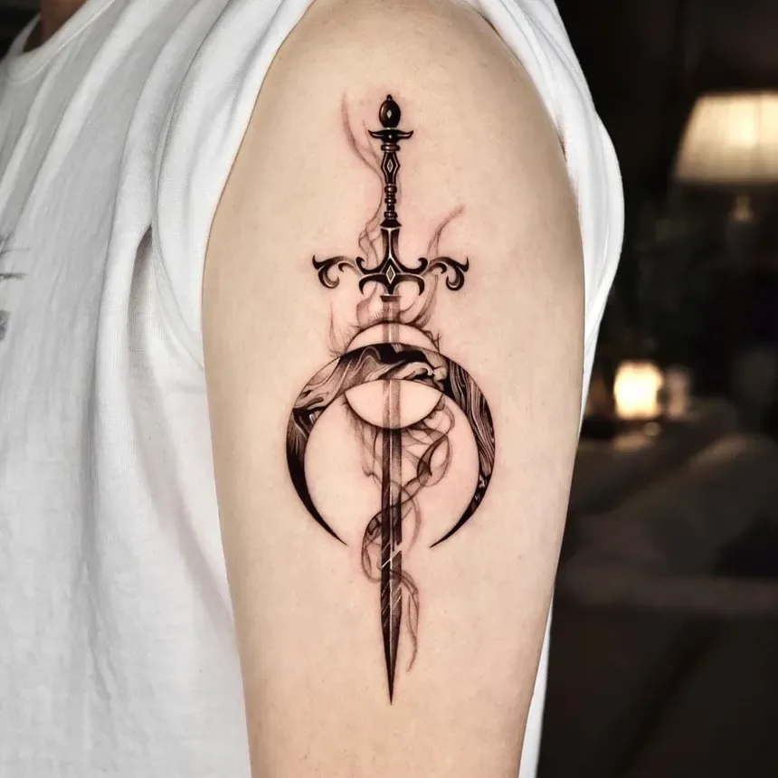 The sword and moon tattoo blends the symbolism of strength and intuition, combining the power of the sword with the subtle and mystical energy of the moon. The sword represents courage, action, and defense, while the moon symbolizes emotion, mystery, and intuition. Together, these elements speak to the balance between the logical and the intuitive, the active and the passive. A sword and moon tattoo can represent the ability to face challenges with strength while staying true to one’s emotional wisdom. It can also symbolize a connection to the cycles of life, where the sword fights through obstacles, and the moon guides through intuition and understanding. This tattoo design is often depicted with the sword cutting through or interacting with the moon, highlighting the duality of human experience. It’s a powerful choice for those who value the connection between their inner strength and emotional intelligence. The tattoo can be placed on the forearm, side, or back, where both the sword and the moon can be shown in their symbolic entirety, making for a striking and meaningful design.