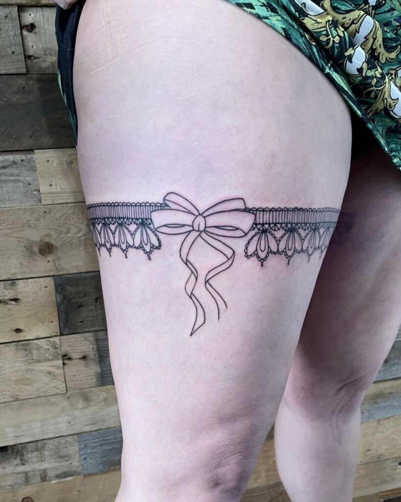 Wraparound garter tattoos are popular for their wearable-art quality, resembling lingerie while carrying deep personal meaning. This design is perfect for those who want to express individuality and strength while embracing the timeless beauty of lace and ribbon-inspired body art.