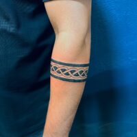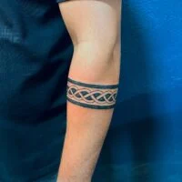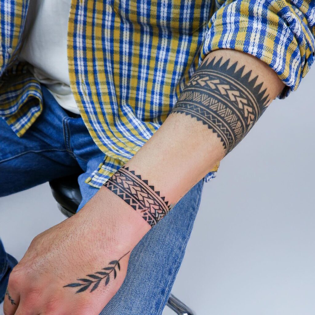 This wraparound tattoo features bold tribal patterns encircling the forearm and wrist, blending geometric precision with cultural symbolism. The alternating triangular shapes and woven motifs create a striking sense of rhythm and flow, emphasizing strength and heritage. Its bold lines contrast beautifully against the skin, making it both visually powerful and timeless.