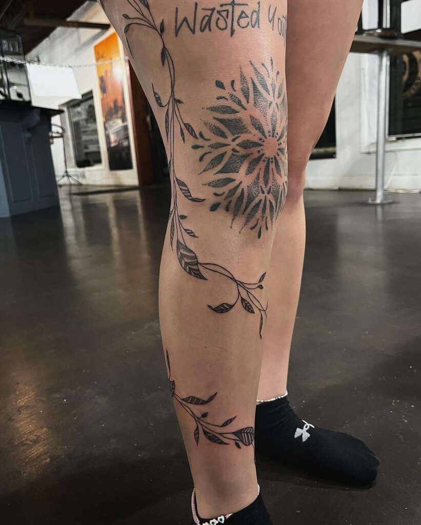 This striking leg tattoo incorporates leafy vines that wrap gracefully around the calf, blending seamlessly with a large floral mandala near the knee. The intertwining leaves create a flowing, organic movement that gives the illusion of nature climbing up the leg.