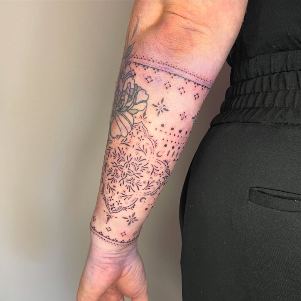 Intricate and ornamental, this wraparound tattoo combines mandala-like patterns with dot work and floral accents. The geometric symmetry blends seamlessly into the forearm’s natural shape, creating an elegant decorative band. Mandala designs often symbolize balance, unity, and spiritual connection, while the surrounding dot work adds texture and softness.