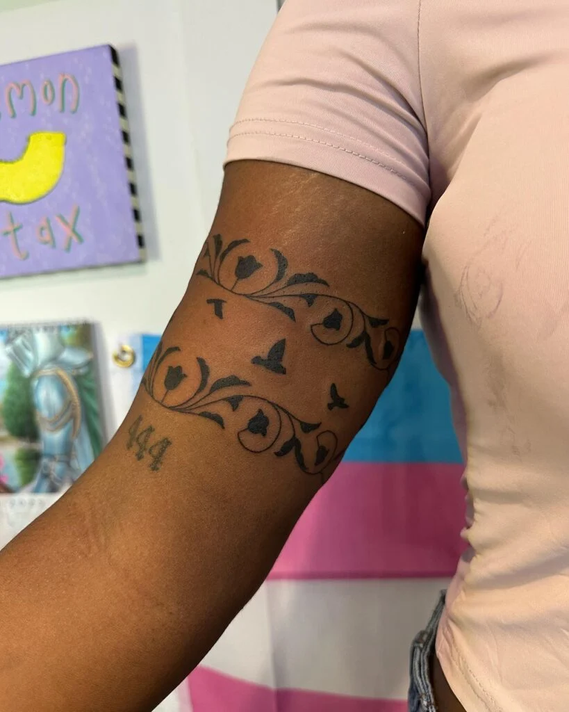 This wraparound tattoo encircles the upper arm with flowing vine-like patterns, interwoven with leaves and accompanied by silhouettes of birds in flight. The design evokes freedom, harmony, and connection to nature, while its elegant curves soften the boldness of an armband tattoo.