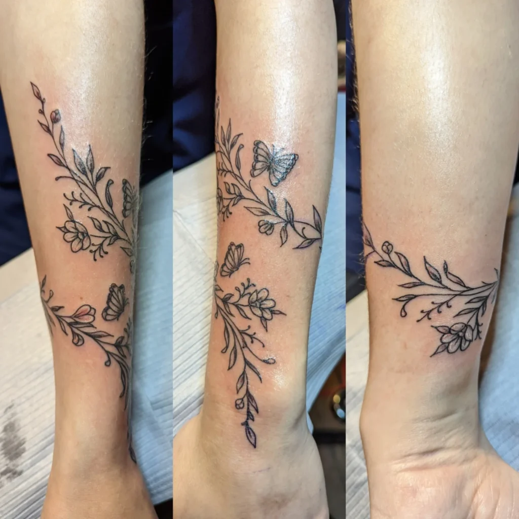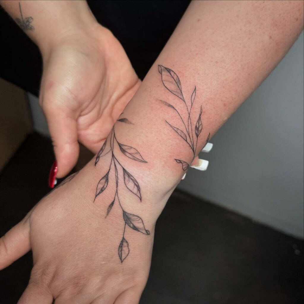 This wraparound tattoo features delicate branches and leaves extending around the wrist, emphasizing simplicity and natural beauty. Its fine-line style creates a light, airy feel that looks almost hand-drawn, symbolizing growth, renewal, and a grounded connection to nature. The placement around the wrist mimics the look of a bracelet, subtle yet deeply personal.
