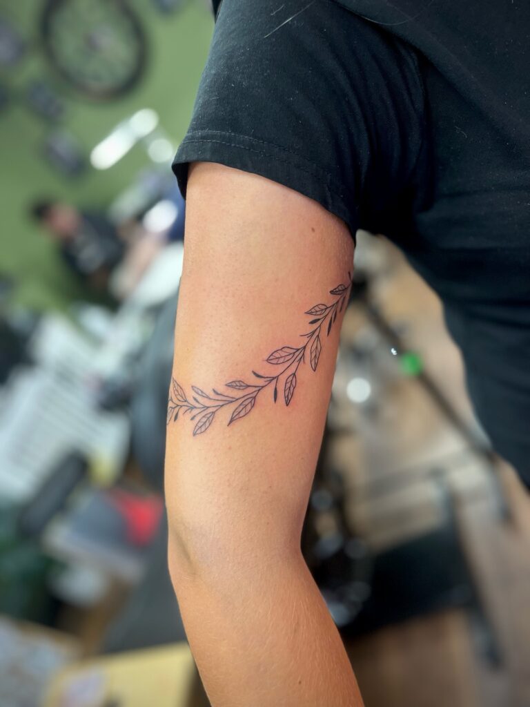 This wraparound tattoo uses simple yet elegant leaves to create a natural bracelet around the arm. The flowing linework keeps the design minimal and airy, giving it a timeless and versatile look. Its botanical theme connects to ideas of growth, renewal, and harmony with nature.