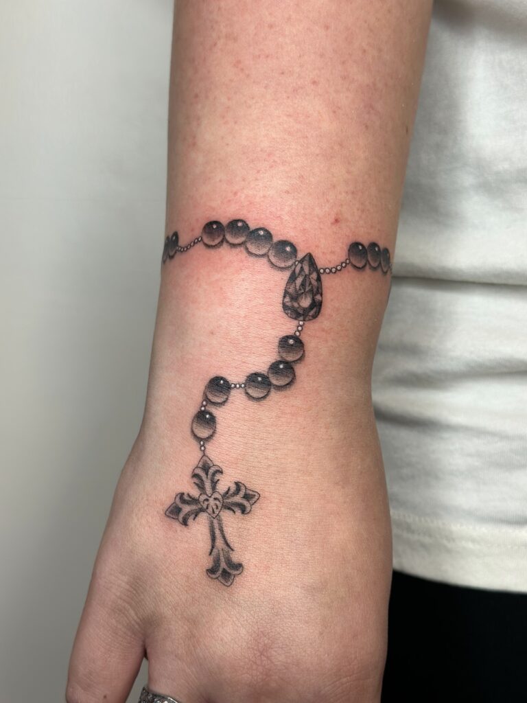 This wraparound tattoo beautifully imitates a rosary encircling the wrist, complete with shaded beads and a cross draping elegantly over the hand. The shading gives the design a realistic, almost three-dimensional effect, enhancing its sacred and symbolic presence. Rosary tattoos are often worn as a sign of faith, devotion, and spiritual protection.
