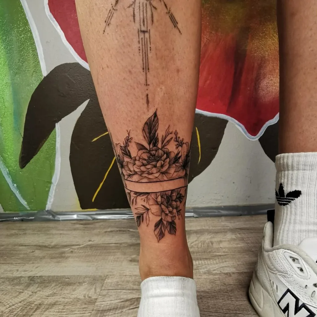 Delicate yet striking, this wraparound tattoo features blooming flowers and intricate leaves encircling the leg. The contrast between the naturalistic floral details and the clean dividing line creates a harmonious balance, symbolizing beauty, growth, and renewal.