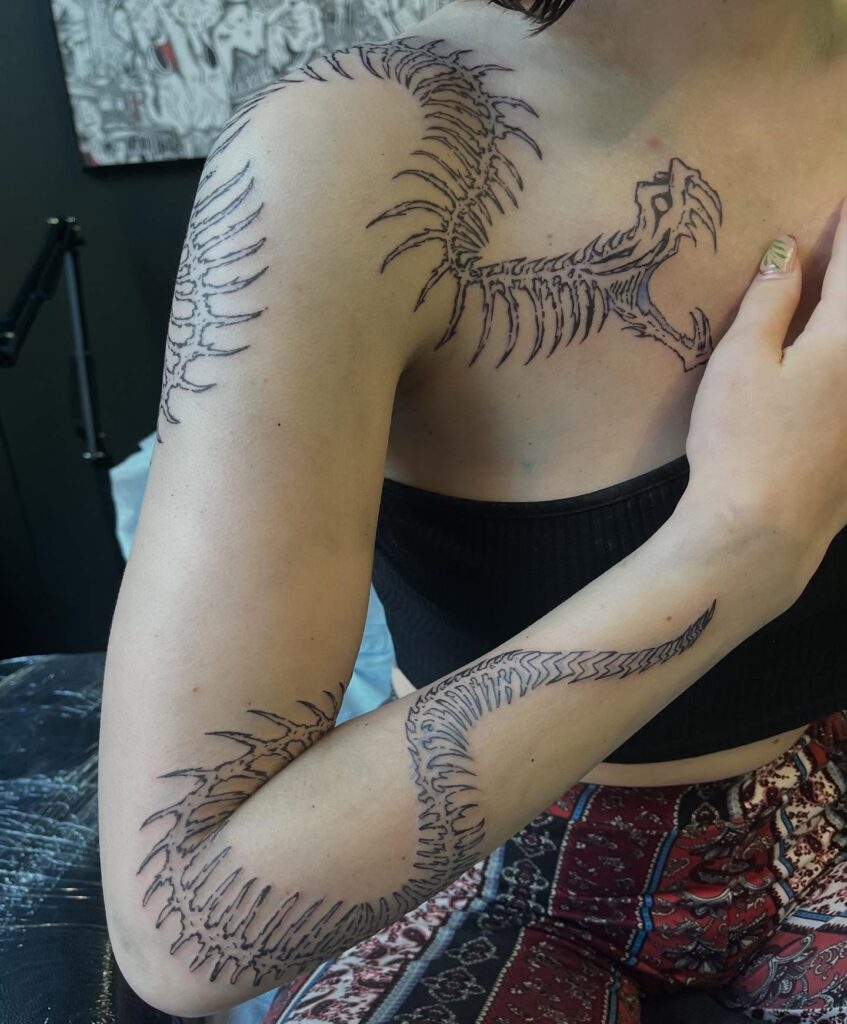 This striking wraparound tattoo features the skeletal outline of a serpent or dragon winding around the arm, shoulder, and forearm. Its skeletal design adds an edgy, gothic feel, symbolizing mortality, transformation, and resilience. The wraparound placement enhances its dynamic movement, almost as if the creature is slithering across the skin.