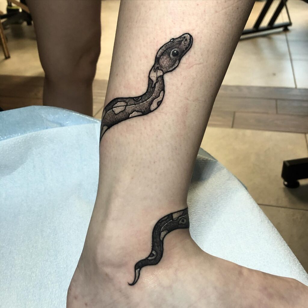This wraparound tattoo captures the natural movement of a snake winding gracefully around the ankle. Its detailed shading brings the reptile to life, with realistic scales and expressive eyes adding intensity. Snake tattoos often symbolize transformation, protection, or rebirth—making this piece as meaningful as it is eye-catching.