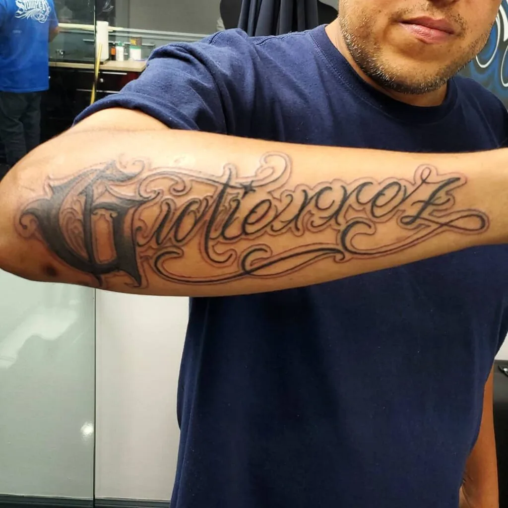 This bold lettering tattoo makes a powerful personal statement, stretching across the forearm in a striking calligraphic style. The name “Gutierrez” is inked in a combination of sharp and flowing strokes, showcasing both strength and artistic flair.