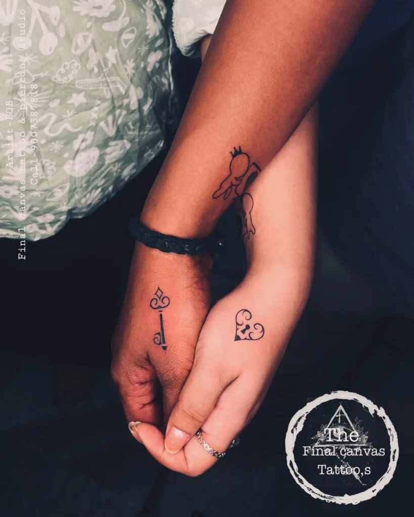 The minimalist design ensures elegance while carrying deep emotional significance. Perfectly placed on the wrist and hand, the tattoos are a constant reminder of connection, trust, and devotion. This pair design beautifully captures the essence of a lasting bond, making it ideal for couples seeking meaningful ink.