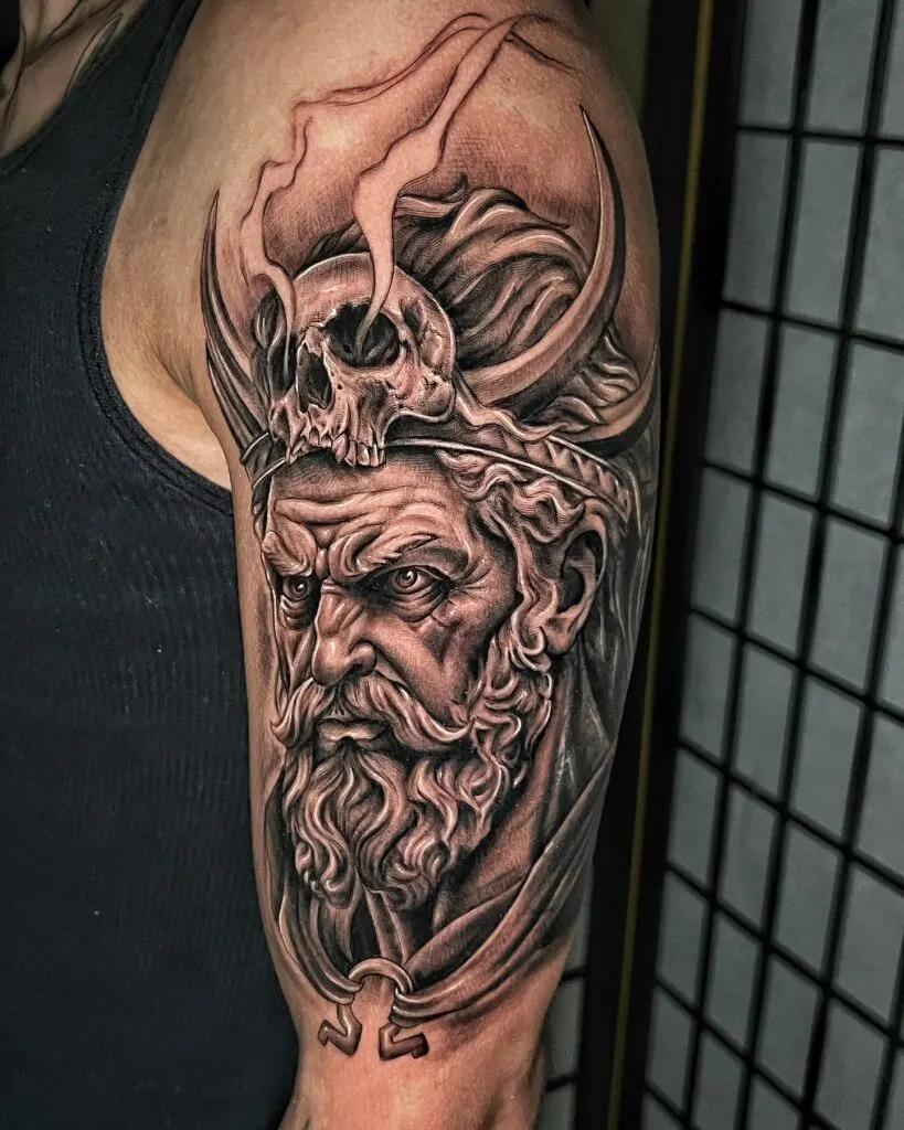 This striking upper-arm tattoo features a hyper-realistic depiction of a Norse warrior, complete with a horned helmet crowned by a menacing skull. The artist’s shading brings life to the fierce expression, capturing wisdom, strength, and resilience.