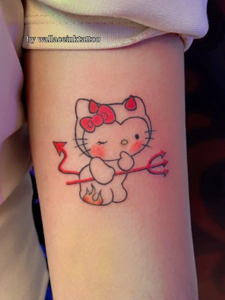 This playful tattoo reimagines the popular Hello Kitty character with a mischievous twist. Depicted with tiny red devil horns, a bow, a trident, and a fiery tail, the design blends innocence with rebellion. The soft shading on the cheeks and the vibrant red accents add charm and liveliness, creating a balance of cute and daring.