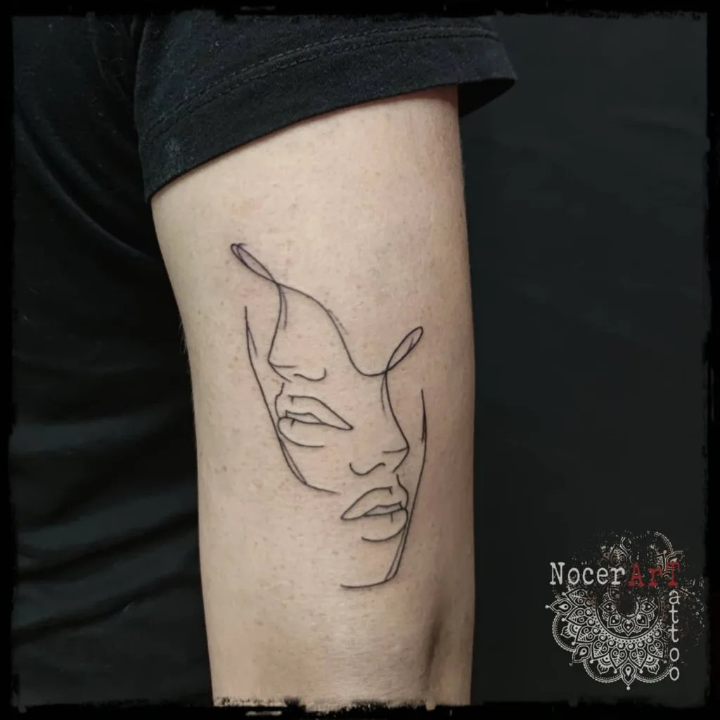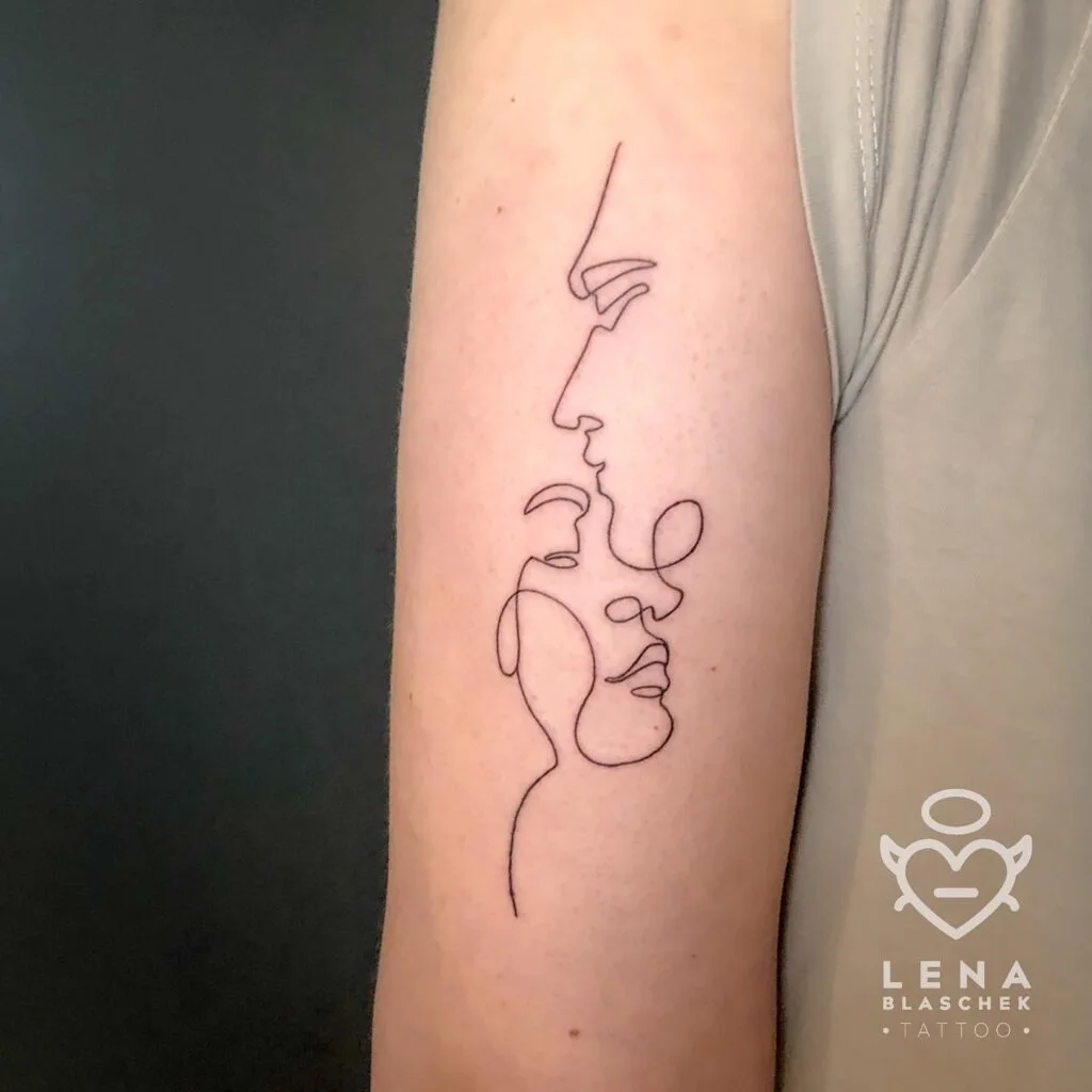 This tattoo presents two faces intertwined through a single unbroken line, forming an intimate kiss. The artwork highlights vulnerability, affection, and the beauty of human connection. Its simplicity emphasizes emotion rather than detail, showing how minimalism can communicate profound intimacy.