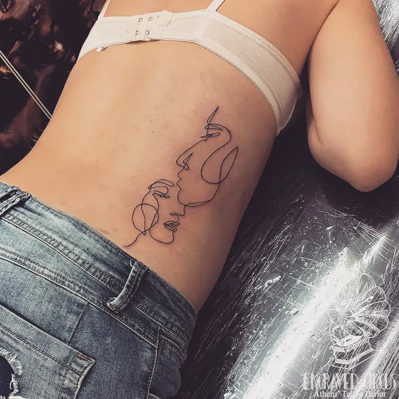 Stretching across the side torso, this continuous line tattoo depicts faces leaning into a kiss. Its larger scale enhances the fluid, sculptural quality of the design, turning the body itself into part of the artwork. The unbroken line weaves intimacy and elegance, showing how love and desire intertwine seamlessly.
