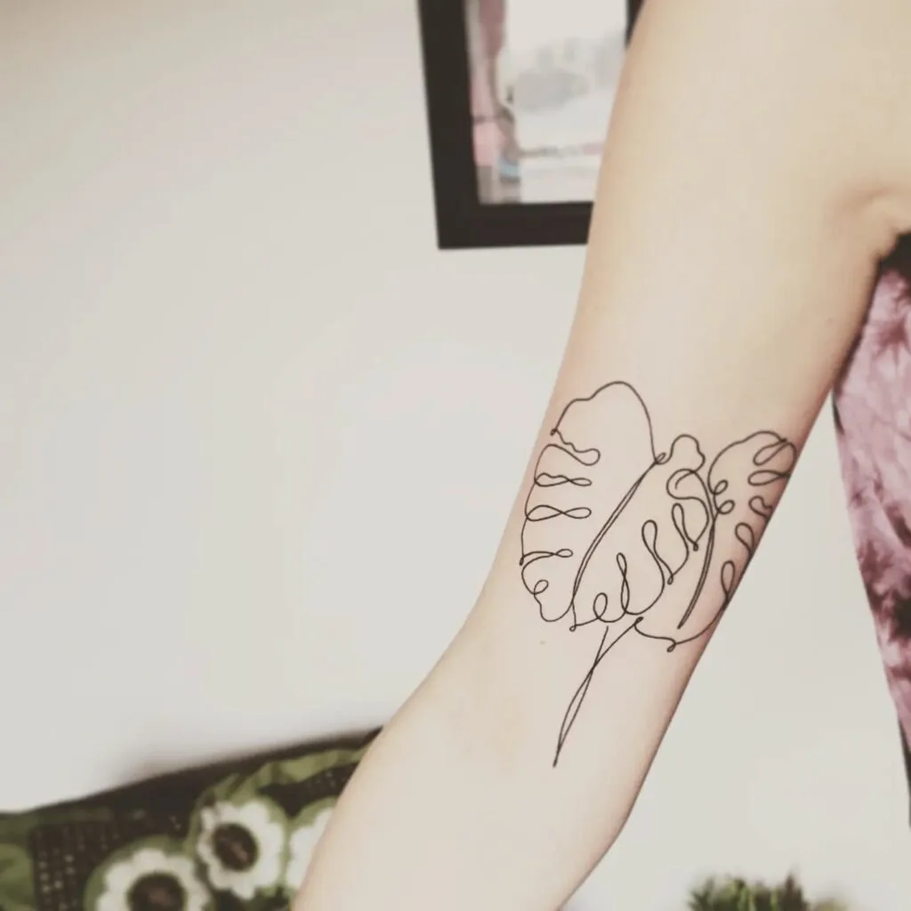 This tattoo depicts large monstera leaves drawn in a single flowing line, capturing their lush tropical character with minimal detail. The design celebrates growth, vitality, and the natural beauty of imperfection. Monstera plants are often linked to resilience and expansion, as their iconic split leaves grow and evolve uniquely.