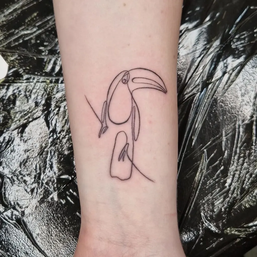 This tattoo transforms the exotic toucan into a minimal line drawing, maintaining its distinctive beak and playful posture. By using a single continuous line, it highlights the bird’s iconic shape while leaving room for imagination and lightness. The toucan symbolizes joy, self-expression, and vibrant presence, often associated with tropical freedom and colorful energy.