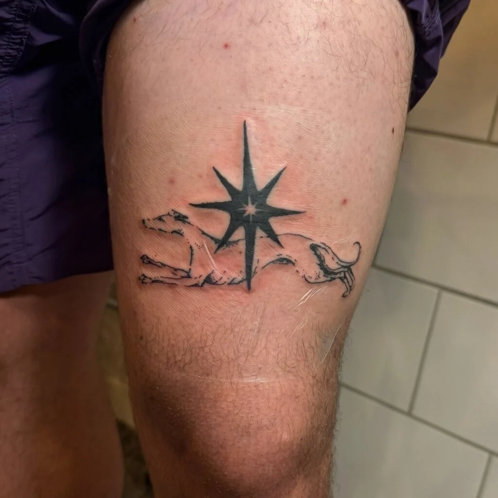 This tattoo fuses celestial wonder with earthly companionship. A sleek, leaping dog silhouette stretches beneath a radiant star, as if chasing its eternal light. The contrast between solid black shading and fine lines creates a surreal, dreamlike effect. Dogs symbolize loyalty, guidance, and protection, while stars represent hope and destiny — together forming a deeply symbolic image.