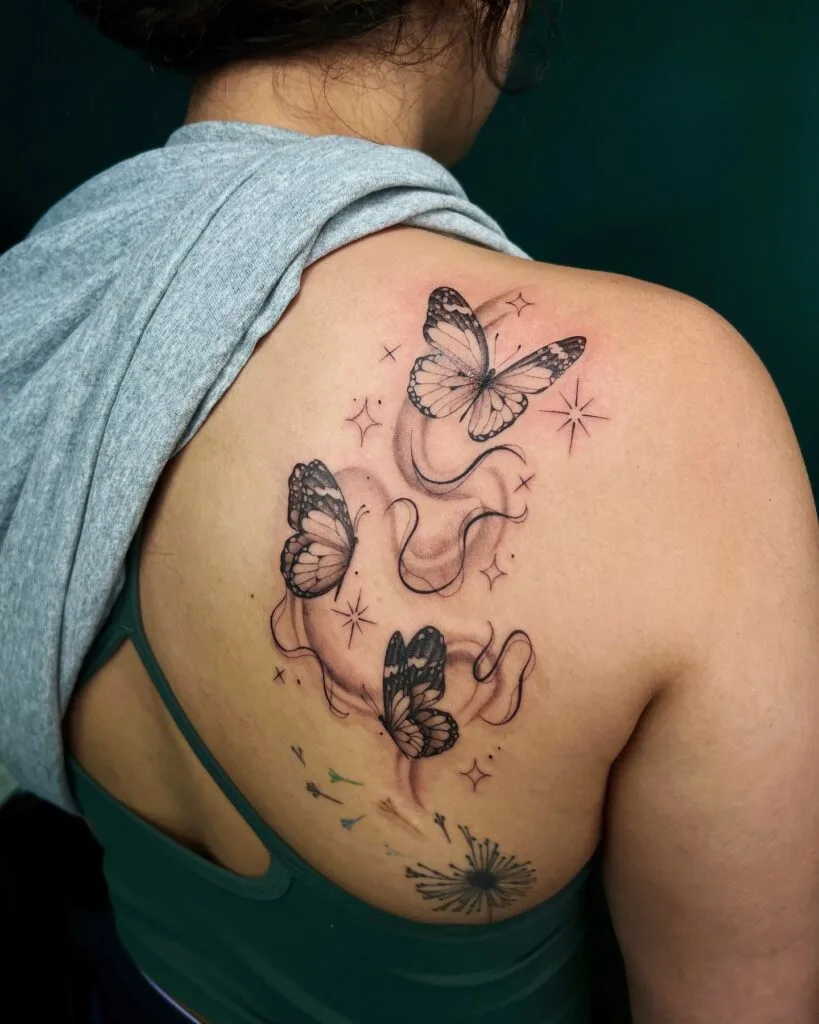 This enchanting tattoo depicts three butterflies drifting gracefully across the shoulder blade, surrounded by shimmering stars and flowing ribbons of light. The soft shading and delicate linework give the butterflies a luminous, ethereal presence, as if they’re caught mid-flight in a dream.