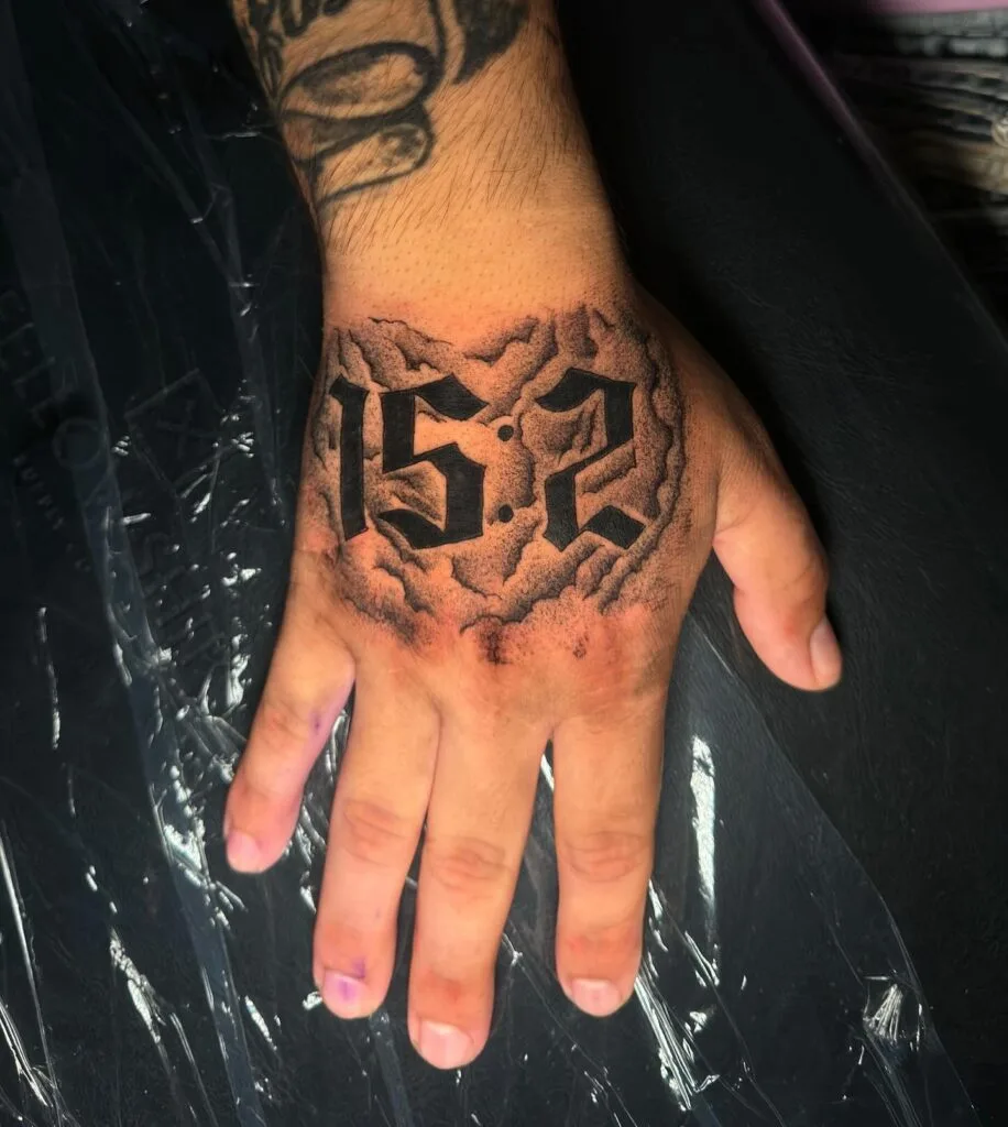 Bold and commanding, this tattoo features the numbers “15:2” carved into the skin with heavy gothic lettering. The design appears surrounded by shadows and textured smoke, giving it a dramatic, almost divine energy. Numbers in tattoos often hold profound significance — a verse, a date, or a code known only to the wearer.