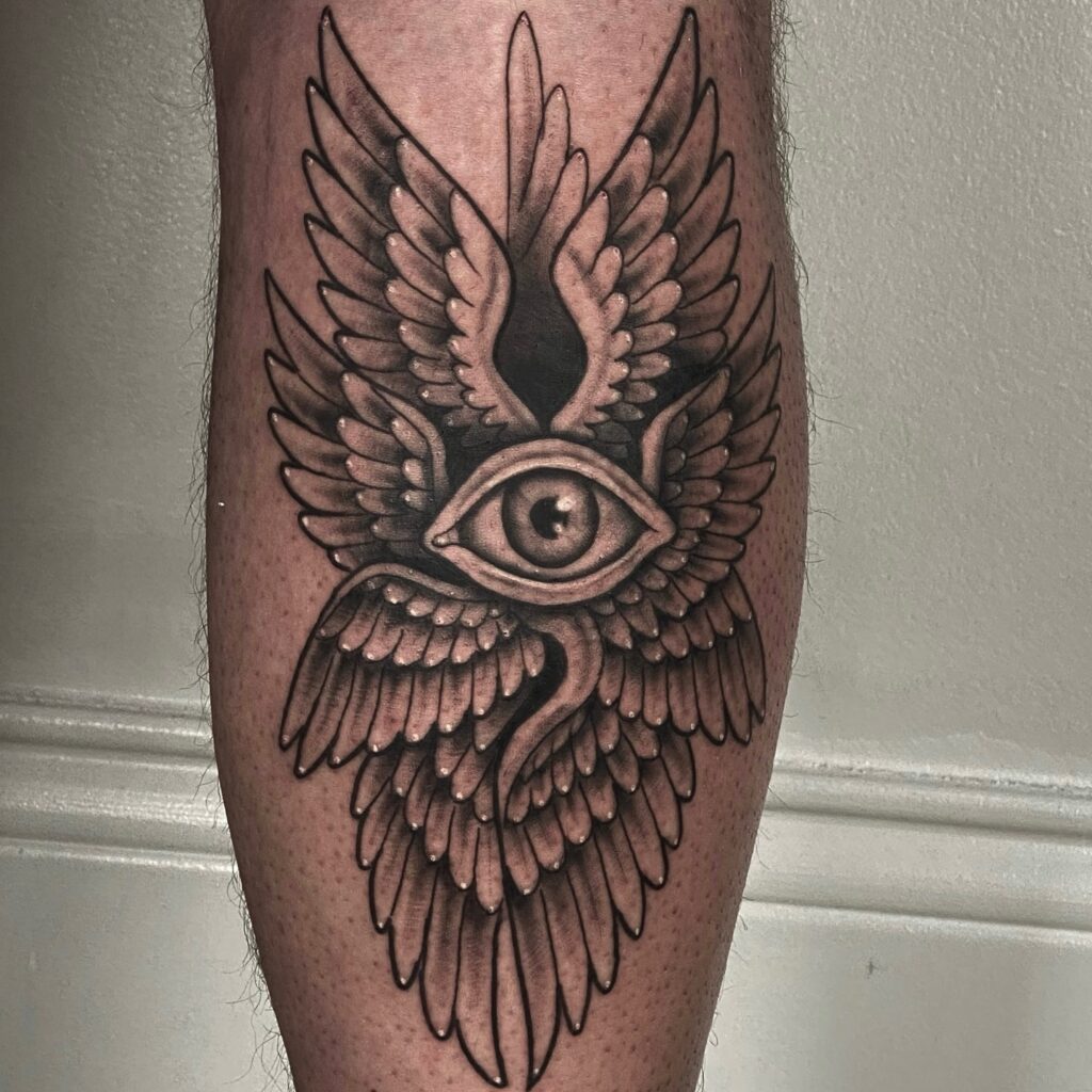 This unique tattoo presents an all-seeing eye surrounded by layered wings, drawing inspiration from biblical angelic imagery. The design symbolizes divine wisdom, guidance, and spiritual vision beyond the earthly realm. The wings are intricately detailed, suggesting both protection and ascension, while the central eye adds an element of mysticism and depth.