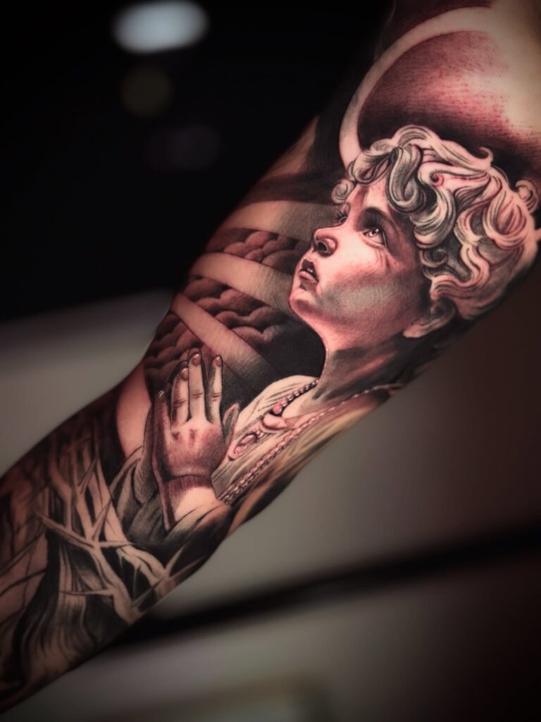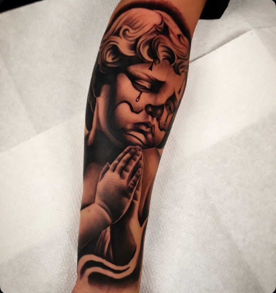 This dramatic tattoo portrays a cherub with clasped hands in prayer and tears streaming down its face. The realism and shading capture deep emotion, making it a striking piece of art. The tears suggest themes of sorrow, repentance, or resilience through hardship, while the prayer position reflects unwavering faith. The placement along the arm enhances its visibility, ensuring it draws attention and respect.