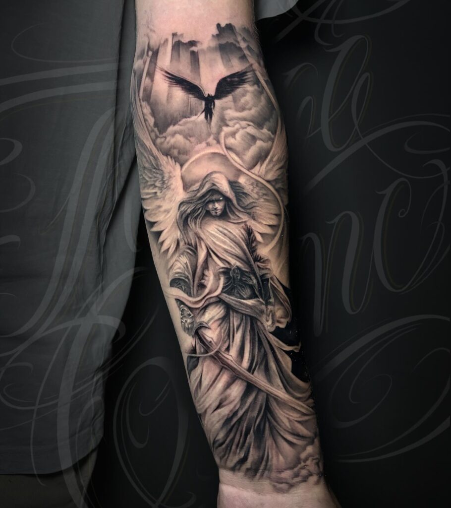 This striking forearm tattoo depicts a powerful archangel cloaked in flowing robes, holding a sword and standing amidst clouds. Above, a soaring bird emphasizes freedom and transcendence, enhancing the divine atmosphere. The detailed shading creates a sense of depth, making the angel appear both protective and commanding.