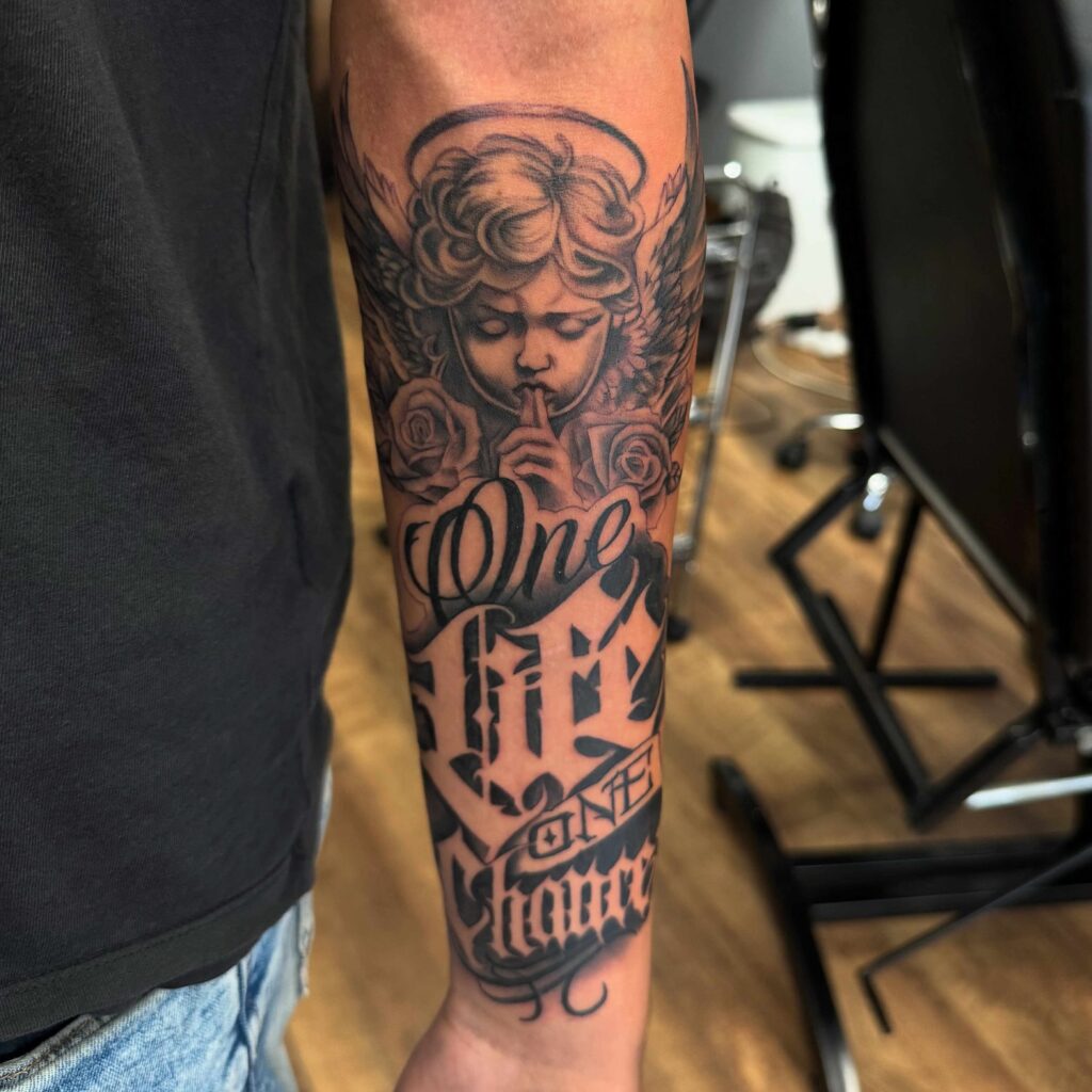 This forearm tattoo features a cherub with a finger to its lips, surrounded by roses and the words “One Life One Chance” in bold script. The angel symbolizes silence, protection, and reflection, while the lettering emphasizes the importance of living fully and embracing each opportunity.