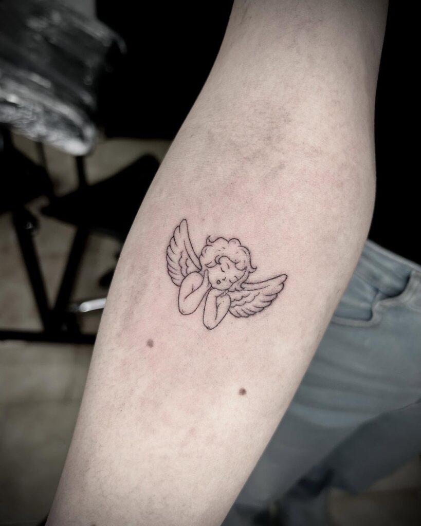 This delicate tattoo features a small cherub with folded hands and detailed wings, rendered in a minimalist fine-line style. Its simplicity highlights purity, innocence, and grace, making it a subtle yet meaningful piece. Perfect for the inner arm, it carries a gentle spiritual presence without overwhelming detail.