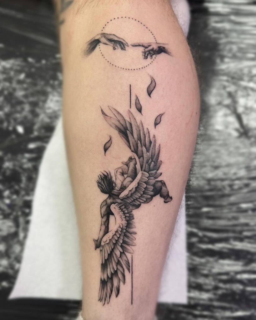 This tattoo portrays a falling angel with outstretched wings, positioned beneath a circular design of two hands almost touching, inspired by Michelangelo’s “Creation of Adam.” The composition symbolizes the delicate relationship between humanity, divinity, and the struggle of imperfection.