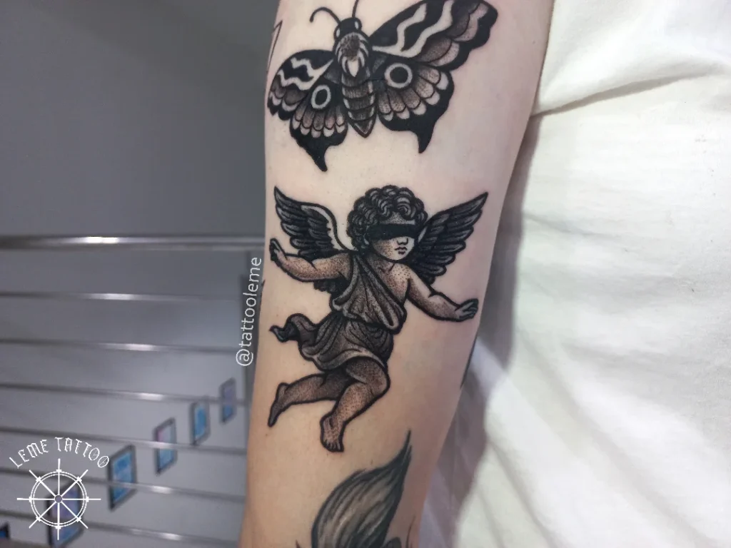 This tattoo shows a cherub with wings, blindfolded and floating, creating a sense of mystery and symbolism. The blindfold suggests innocence untouched by earthly judgment, or perhaps trust in divine will without needing sight.