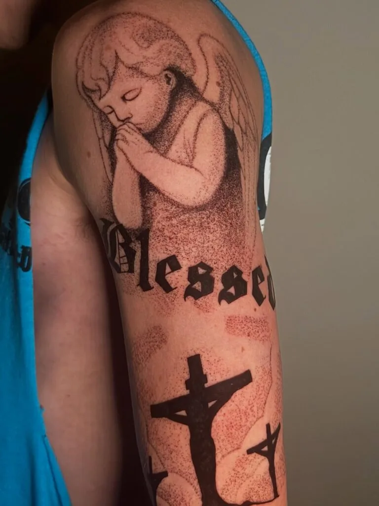 This tattoo features a praying cherub accompanied by the word “Blessed” in bold gothic script, along with crosses at the bottom. The soft dotwork technique gives the angel a delicate, almost glowing appearance, while the darker elements provide contrast and strength.