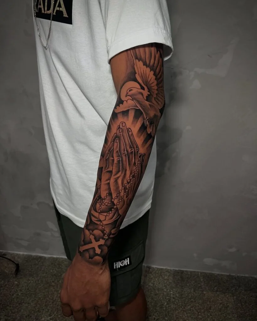 This forearm tattoo blends elements of devotion and hope. At its center are praying hands wrapped with a rosary, symbolizing faith and strength in prayer. Above them, a radiant dove spreads its wings, representing peace, divine presence, and guidance from above.