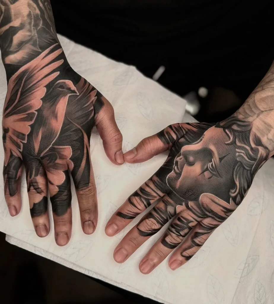 These striking hand tattoos feature a detailed angel on one hand and a dove in flight on the other. The artistry extends across both hands, creating a harmonious balance of faith and freedom. The angel’s gentle face conveys serenity, while the dove symbolizes peace and the soul’s transcendence.