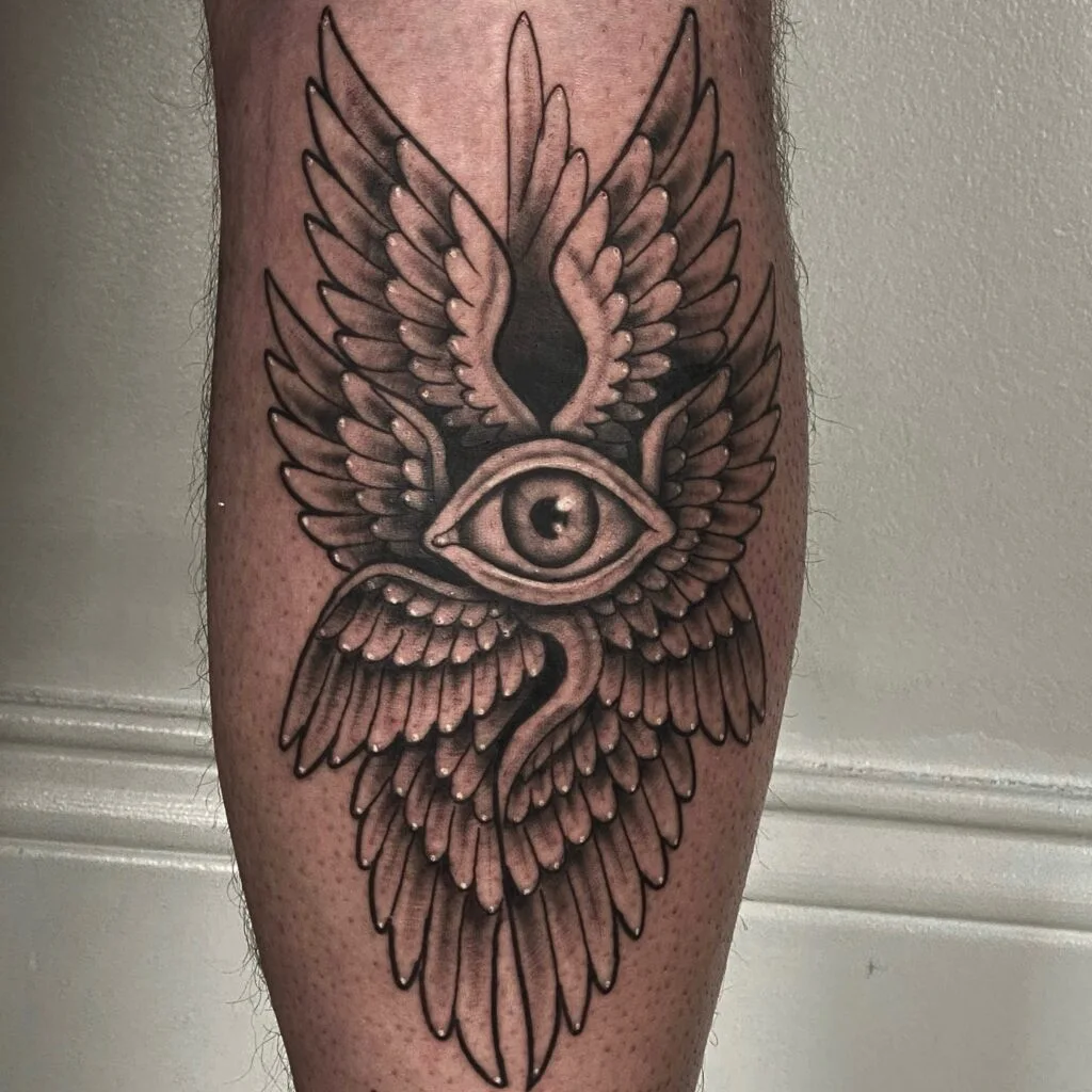 Bold shading enhances the sense of dimension, making the tattoo both captivating and thought-provoking. Ideal for someone who values symbolism, it represents awareness, higher understanding, and the comforting idea that one is always watched over by unseen guardians.