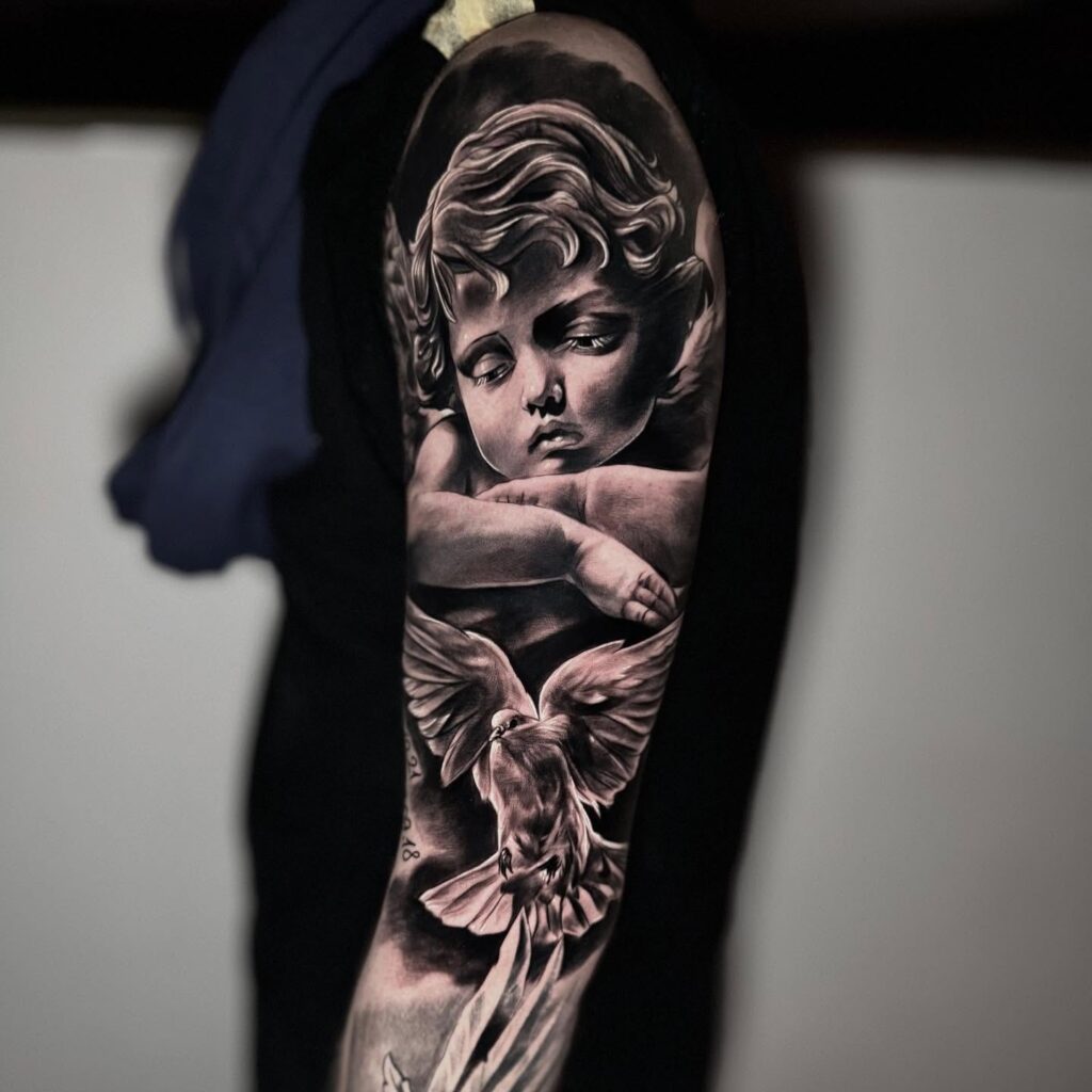 This black and grey tattoo depicts a serene cherub resting its head on folded arms, radiating innocence and calm. The angel’s soft expression adds a sense of divine peace, while the dove below symbolizes purity and spiritual connection. The shading work is incredibly detailed, giving the design a lifelike depth and three-dimensional effect.