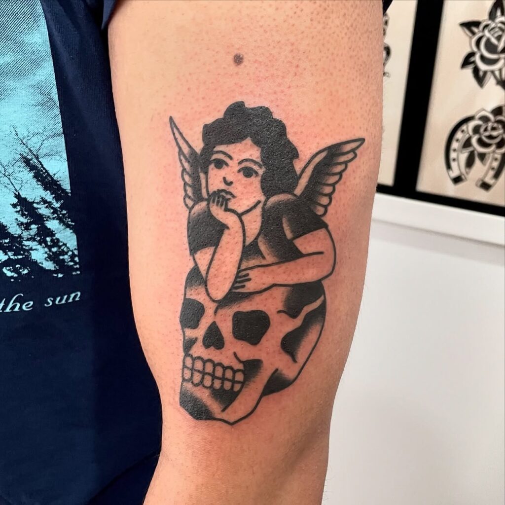 This bold tattoo merges two contrasting symbols: a thoughtful angel resting atop a skull. The design plays on the themes of innocence and mortality, showing how life and death coexist. The angel’s wings add an ethereal quality, while the skull grounds the piece in a more raw, traditional style.