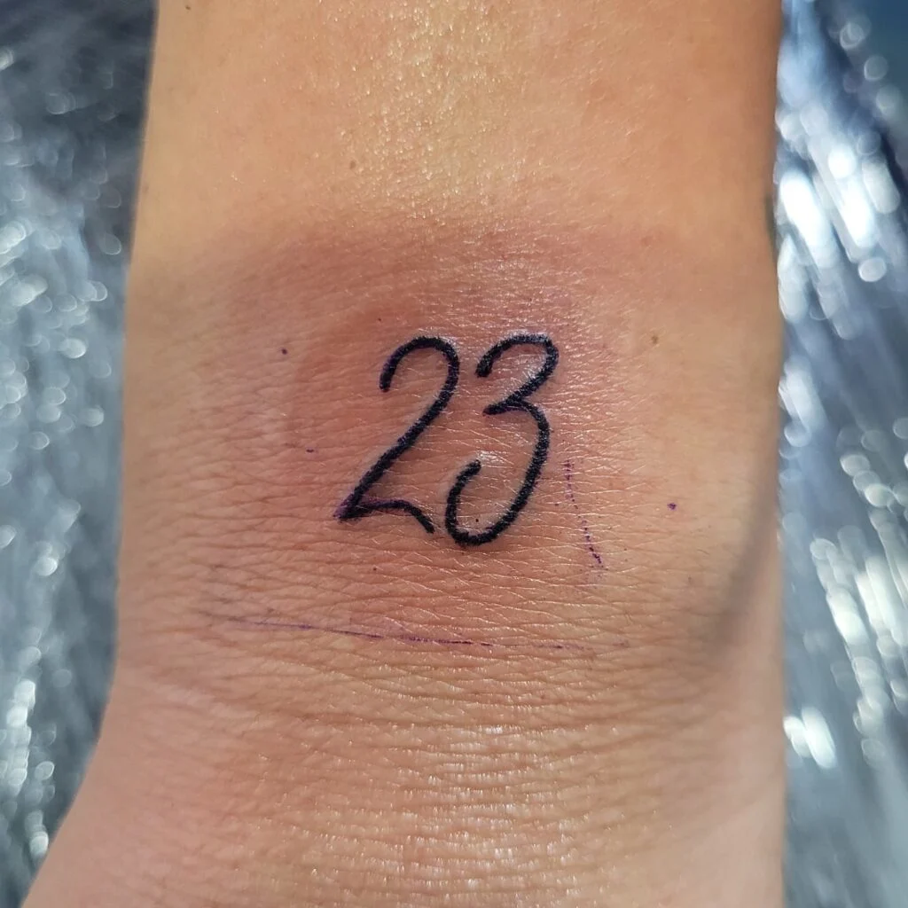 This small yet meaningful tattoo features the number 23 in a fine, script-like style on the wrist. The number itself holds various associations—luck, spiritual significance, or personal milestones such as birthdays, anniversaries, or even a tribute to sports legends.