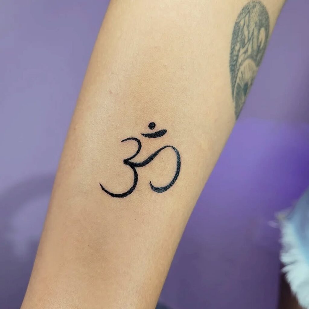 This tattoo features the Om (ॐ) symbol, an ancient and sacred numeral-like emblem from Hindu and Buddhist traditions. Om represents the sound of the universe, spiritual awakening, and unity of mind, body, and soul. Its placement on the arm makes it both visible and personal, serving as a reminder of inner peace, mindfulness, and balance.