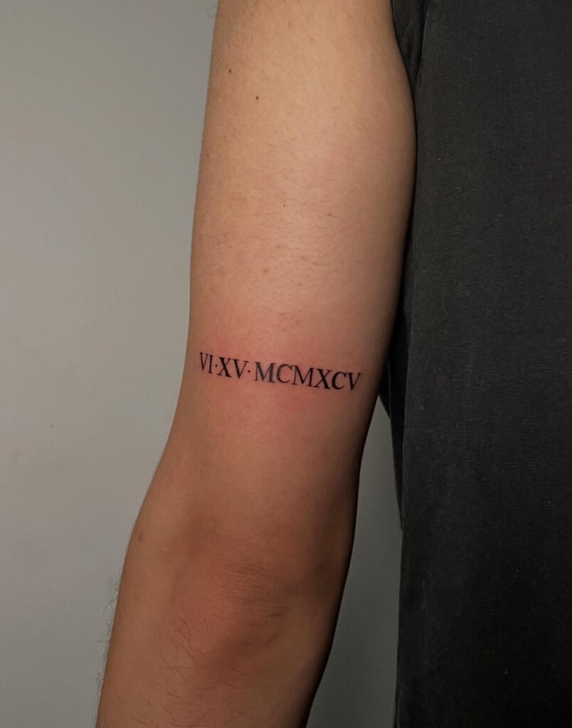 The tattoo VI·XV·MCMXCV (June 15, 1995) is delicately inked around the arm. Roman numerals transform a specific date into a timeless and sophisticated design, often chosen to commemorate births, anniversaries, or life-changing moments. The clean alignment across the bicep ensures legibility while maintaining elegance.