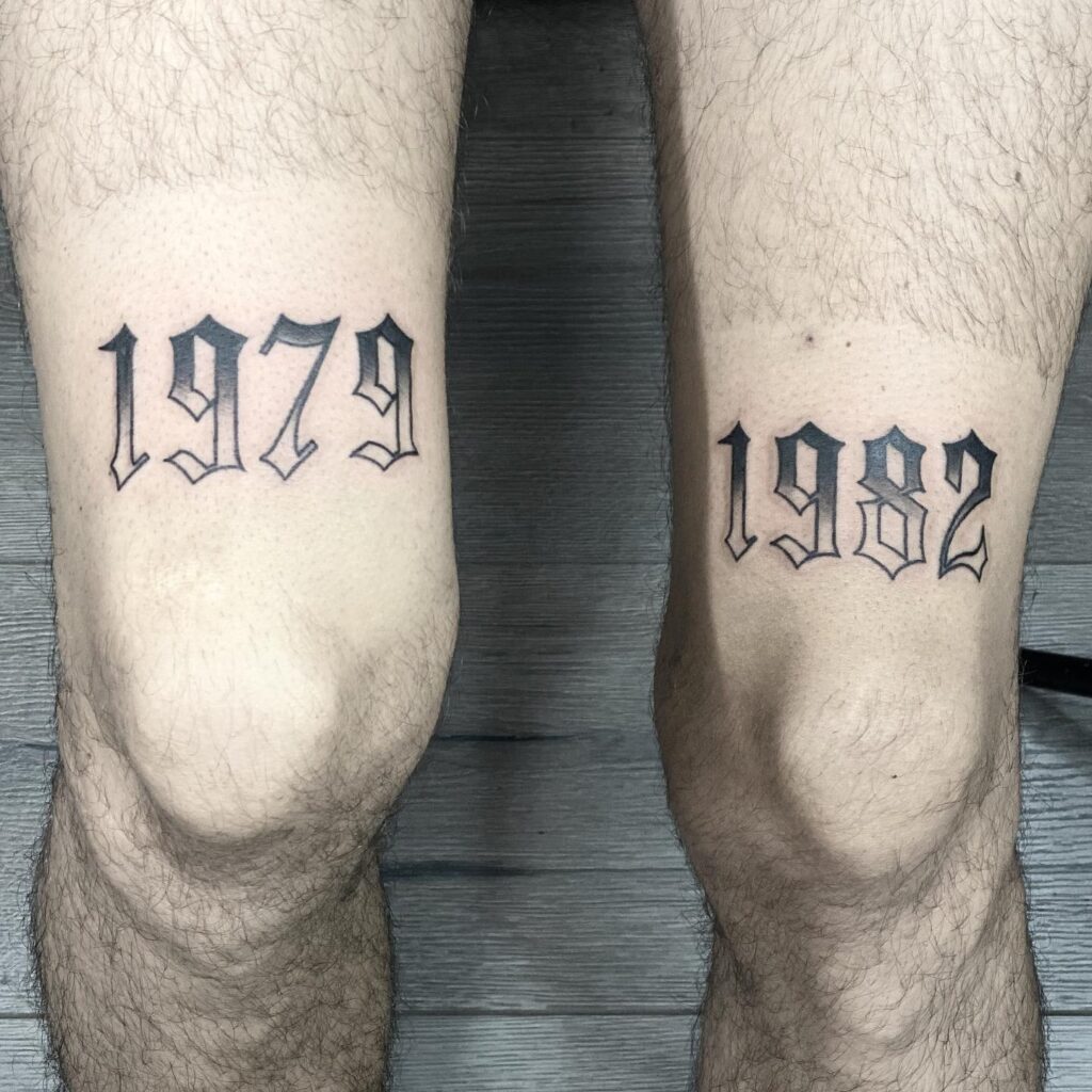 This striking tattoo pair features the years 1979 and 1982, inked above each knee in bold Gothic numerals. The symmetry across both legs creates visual balance while emphasizing the connection between the two years.