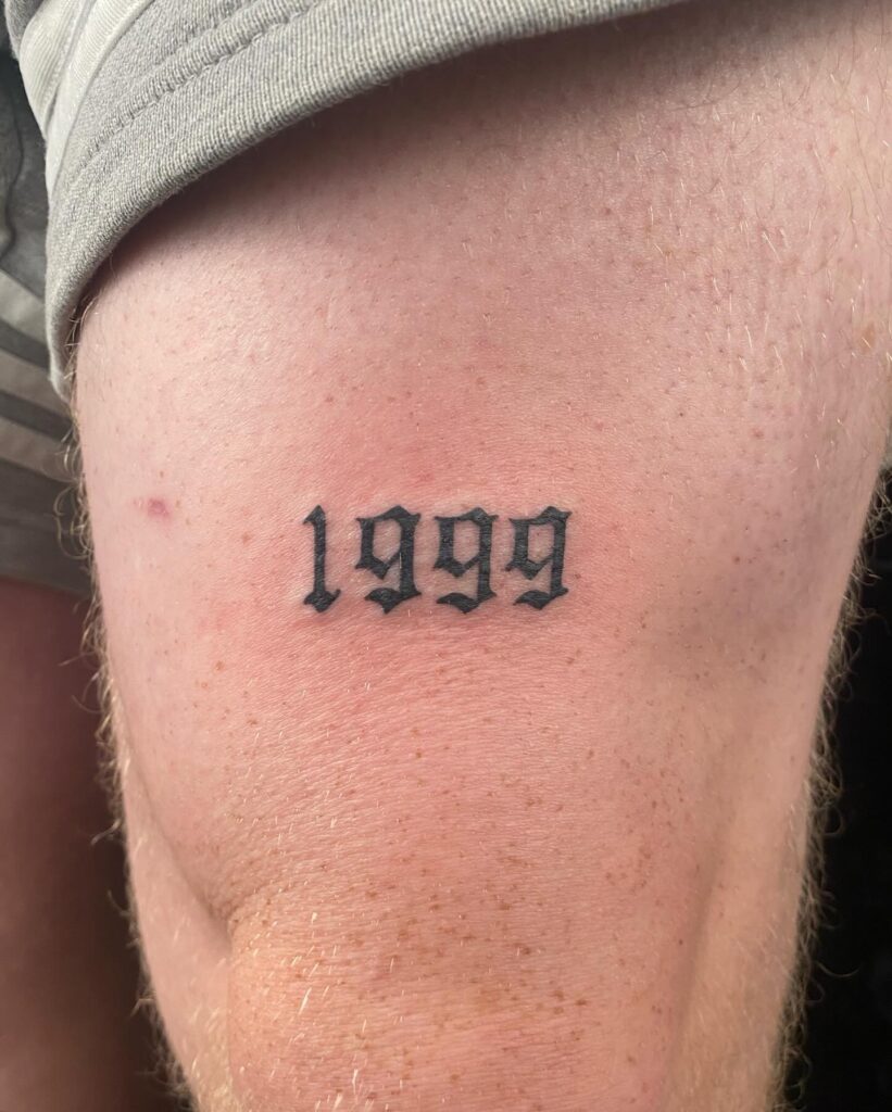 This tattoo boldly presents the year 1999 in Gothic numerals on the thigh. The thick, sharp lettering style enhances its intensity, giving the date a strong and striking presence.