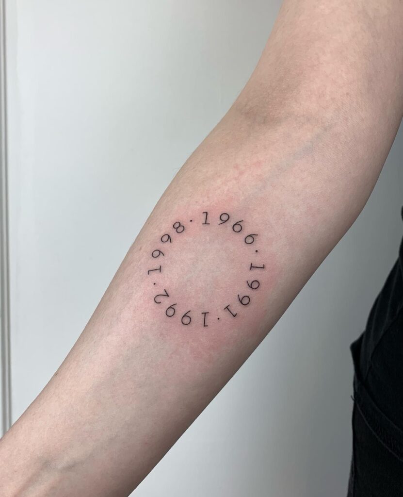 This tattoo arranges multiple years—1966, 1991, 1992, 1998—in a circular pattern on the forearm. The unique design symbolizes continuity, cycles, and eternal connections. Each date likely represents meaningful milestones, perhaps marking family generations or pivotal life events.