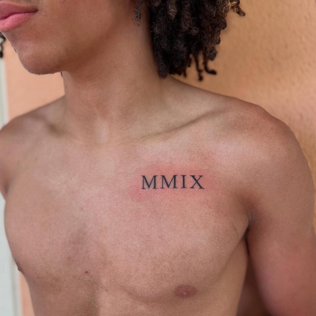 The Roman numeral MMIX (2009) is cleanly inked just above the chest. Its simplicity and bold placement make it a refined yet impactful design. Roman numerals are timeless, often chosen for their elegant appearance and ability to conceal meaning to those unfamiliar.