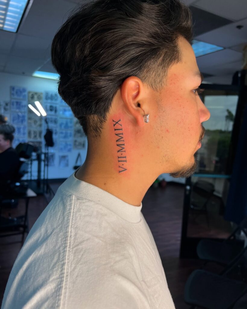 This tattoo showcases VII·MMIX in bold Roman numerals inked along the side of the neck. Roman numerals carry an air of timelessness and elegance, often chosen to mark important dates such as birthdays, anniversaries, or life-changing events. Placed prominently on the neck, it demonstrates confidence and a desire to wear one’s story openly.