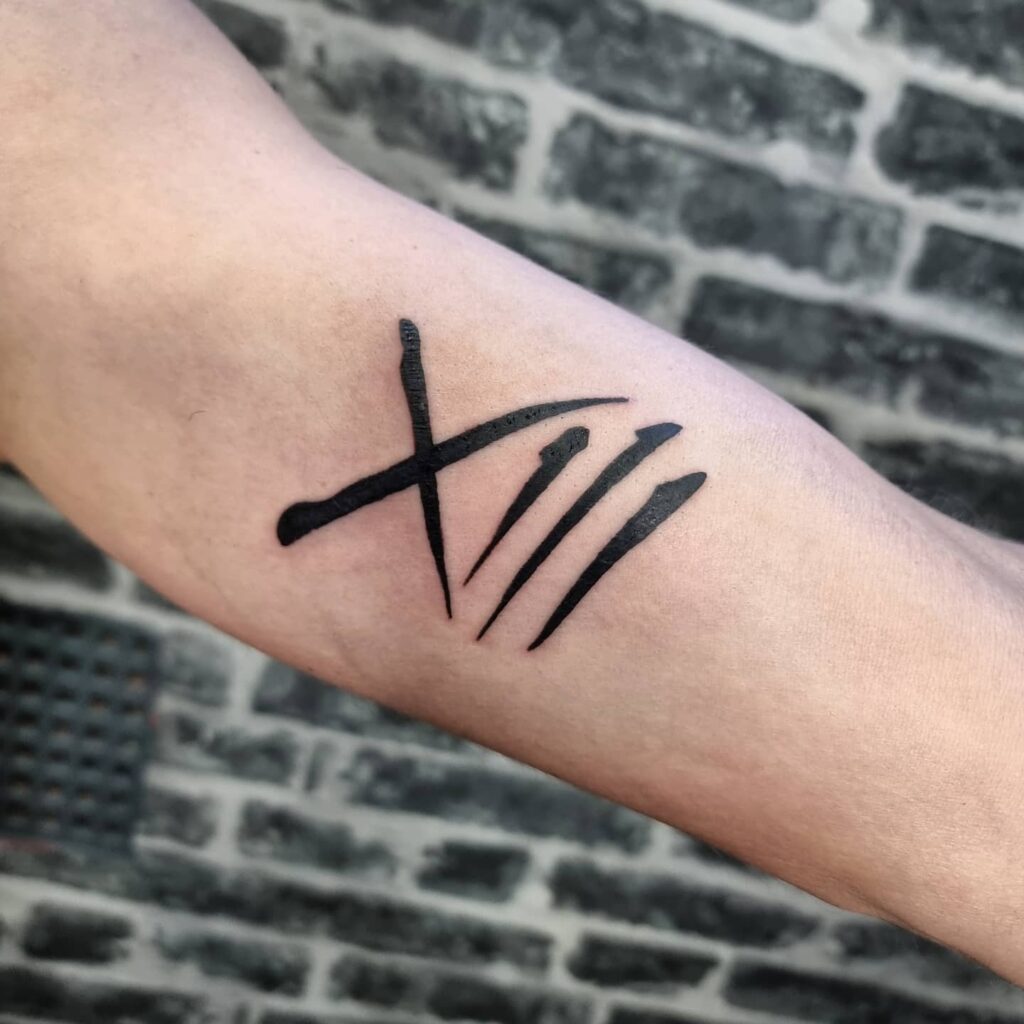 This striking tattoo depicts XIII (13) in bold, brushstroke-like Roman numerals on the arm. Known as a number with both mystical and rebellious connotations, 13 often represents defiance against superstition, personal strength, or transformation.