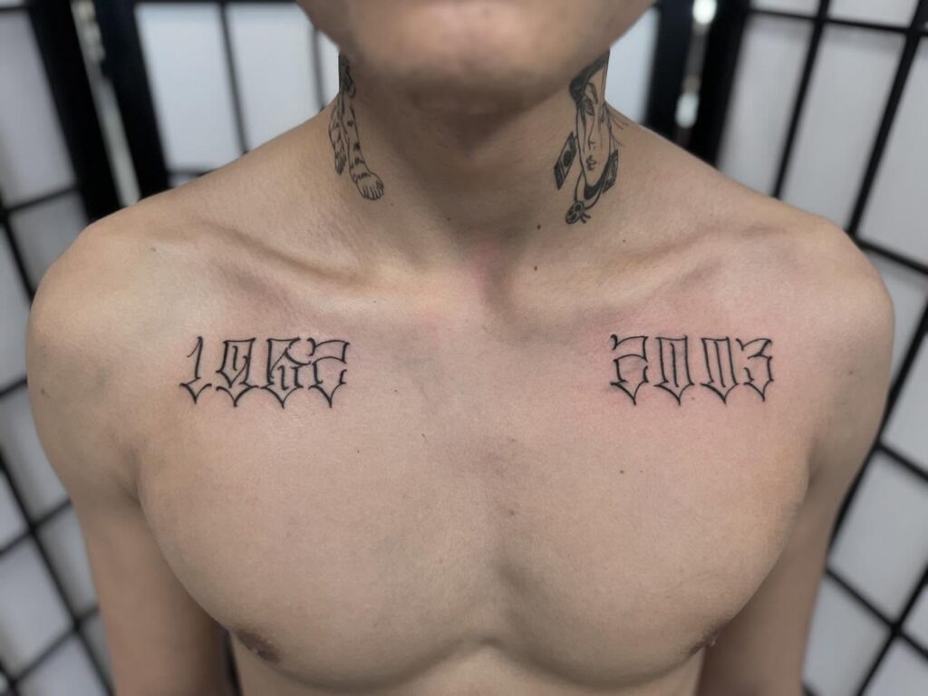 Etched across the chest, this tattoo presents two years—1963 and 2003—in a bold, Gothic-inspired font. Positioned just beneath each collarbone, the numbers balance the chest visually while carrying deep personal meaning.