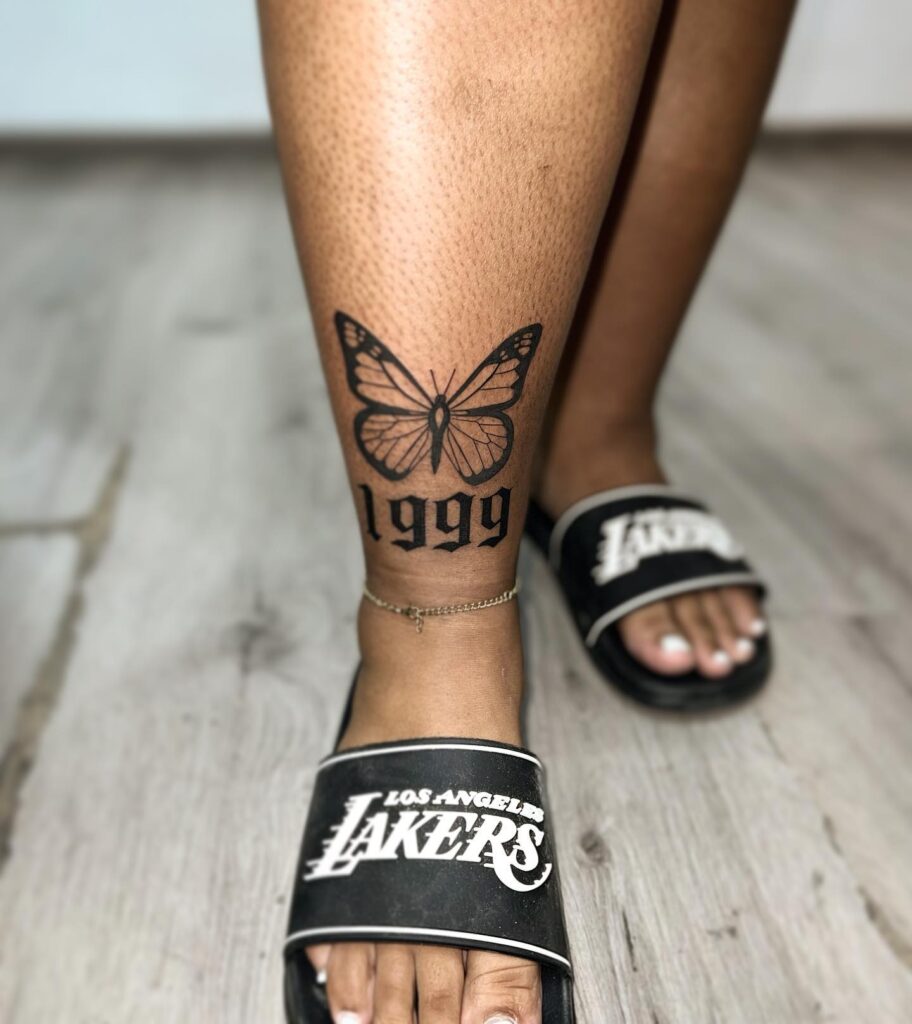Set on the calf, the tattoo balances soft, delicate wings with sharp, gothic-style numerals, creating a striking contrast. The placement allows the design to flow naturally with the leg’s form, making it visually appealing while carrying deep personal meaning. Together, the butterfly and year tell a story of change, resilience, and the significance of a pivotal life moment.